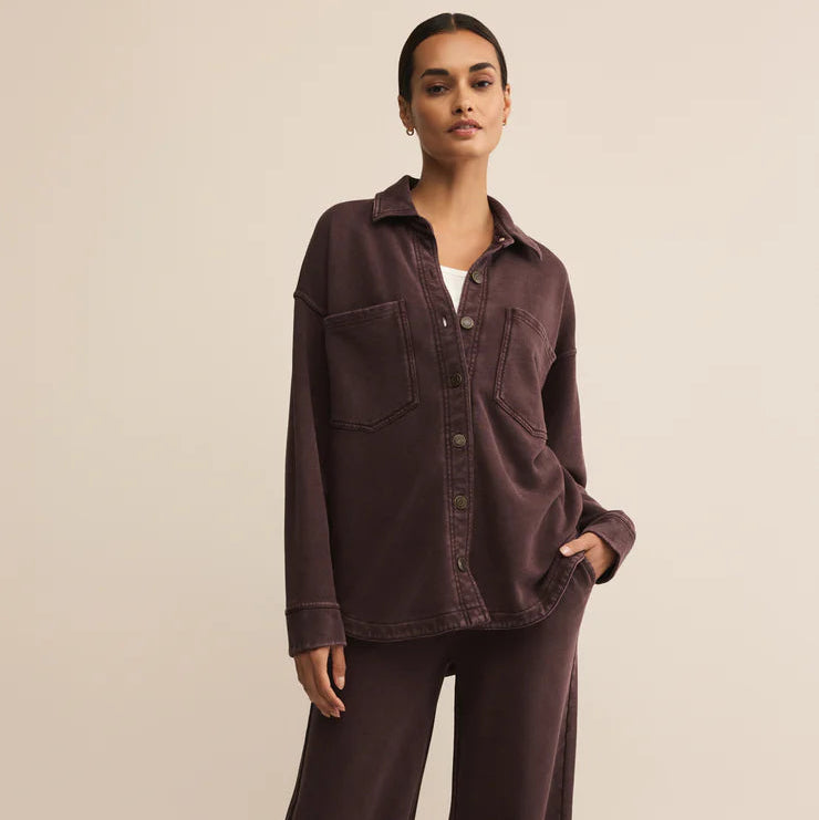 Features: Relaxed fit, Cotton French Terry: 100% Cotton, Collared, Long sleeve, Button front, Patch pocket, Lightweight, Mineral wash, colour: chocolate brown